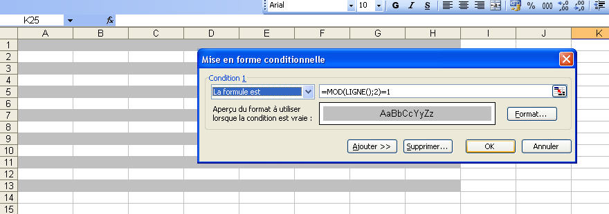 Sélectionner la plage concernée, faire menu Format > Mise en forme conditionnelle... et compléter la boite de dialogue comme ci-dessous en utilisant la formule =MOD(LIGNE();2)=1.
