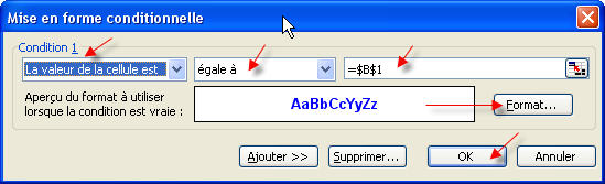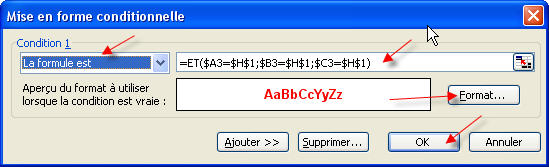 Sélectionner A3:Ax et C3:Cx, faire menu Format > Mise en forme conditionnelle... et compléter la boite de dialogue comme ci-dessous.