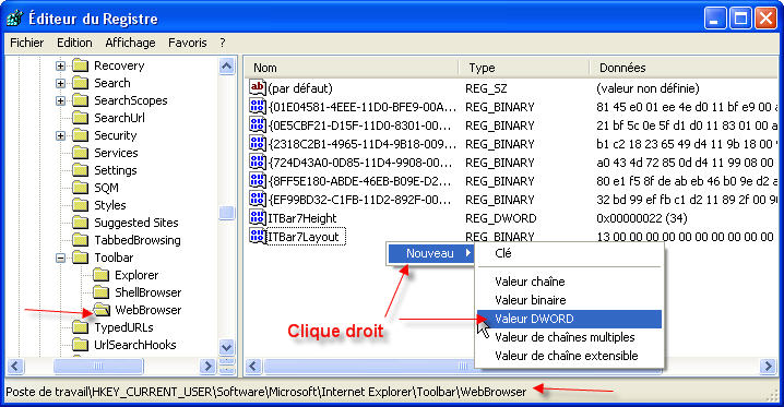 2 - Dans la partie gauche de l’ Éditeur de registre dérouler HKEY_CURRENT_USER\SOFTWARE\Microsoft\Internet\Explorer\Toolbar\WebBrowser